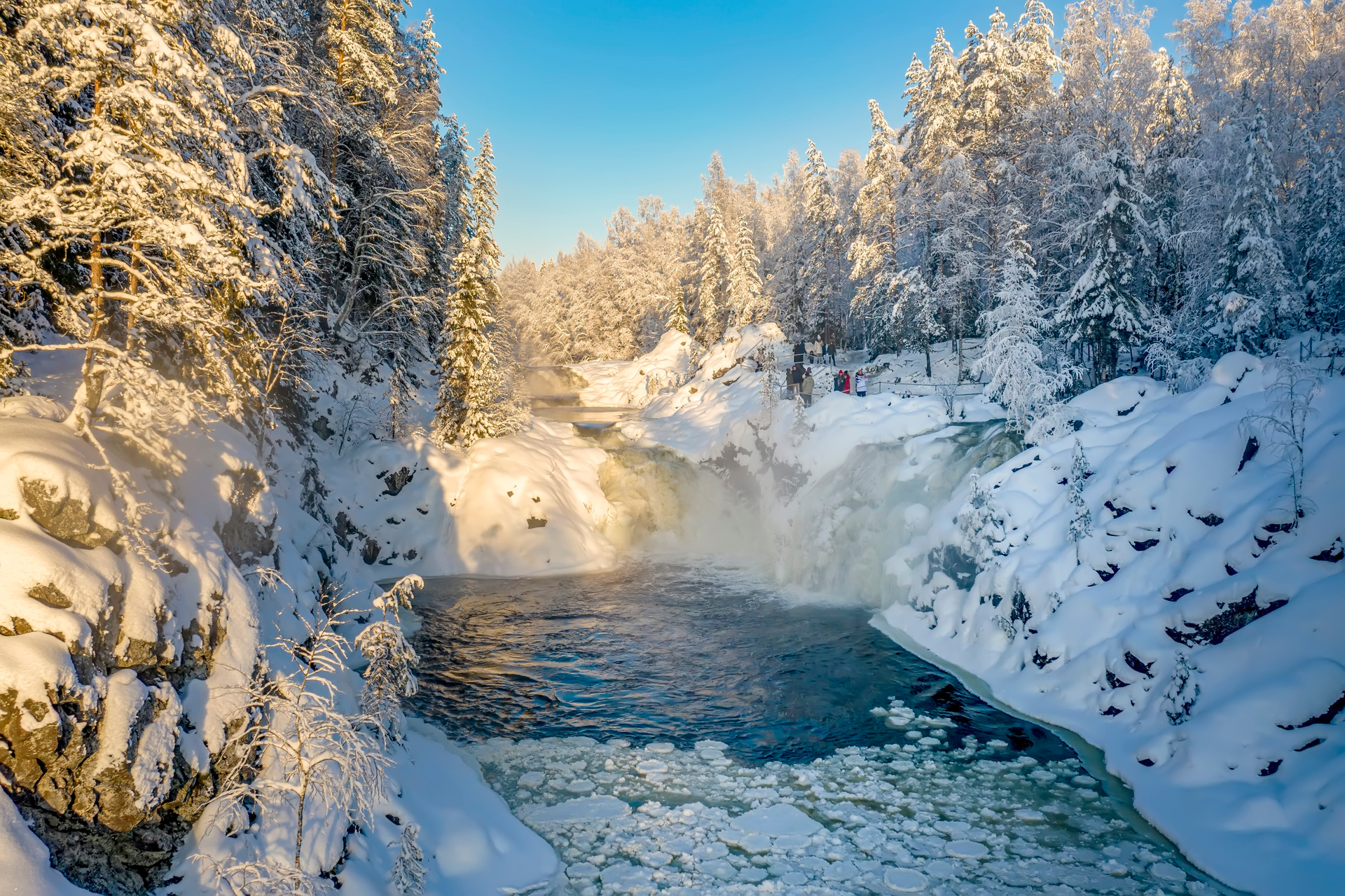 Зимой Кивач не замерзает: его струи бегут мимо заледеневших деревьев по укутанным снегом скалам, нарушая зимнюю тишину и создавая особенно впечатляющий образ карельской природы.